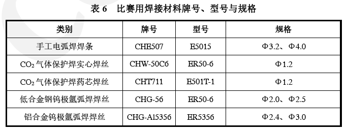②競(jìng)賽所用的焊接材料均由四川大西洋焊接材料股份有限公司提供,焊接材料規(guī)格、型號(hào)和牌號(hào)見(jiàn)表下表。