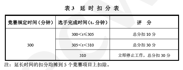 2)選手在規(guī)定時(shí)間內(nèi)未完成競(jìng)賽項(xiàng)目時(shí),最長(zhǎng)可以允許延時(shí)10分鐘的比賽時(shí)間,延時(shí)10分鐘到達(dá)后須立即停止操作。對(duì)延長(zhǎng)的競(jìng)賽時(shí)間,按規(guī)定扣除相應(yīng)分?jǐn)?shù)。