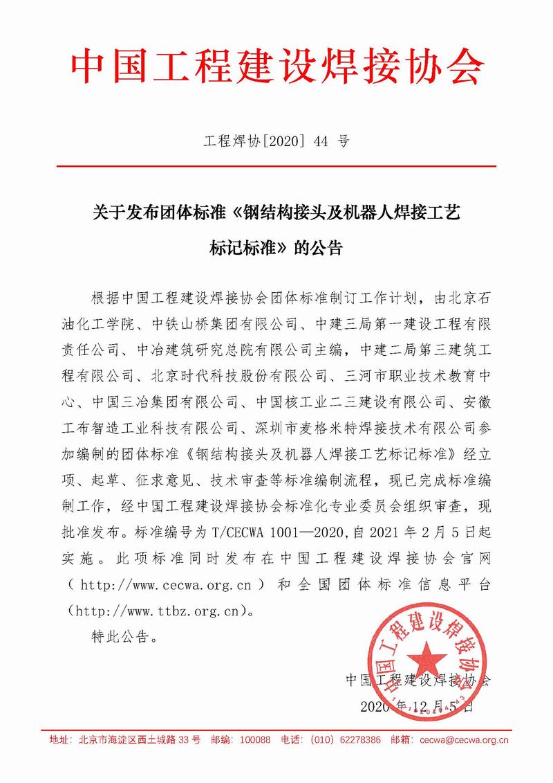 關于發布團體標準《鋼結構接頭及機器人焊接工藝標記標準》的公告