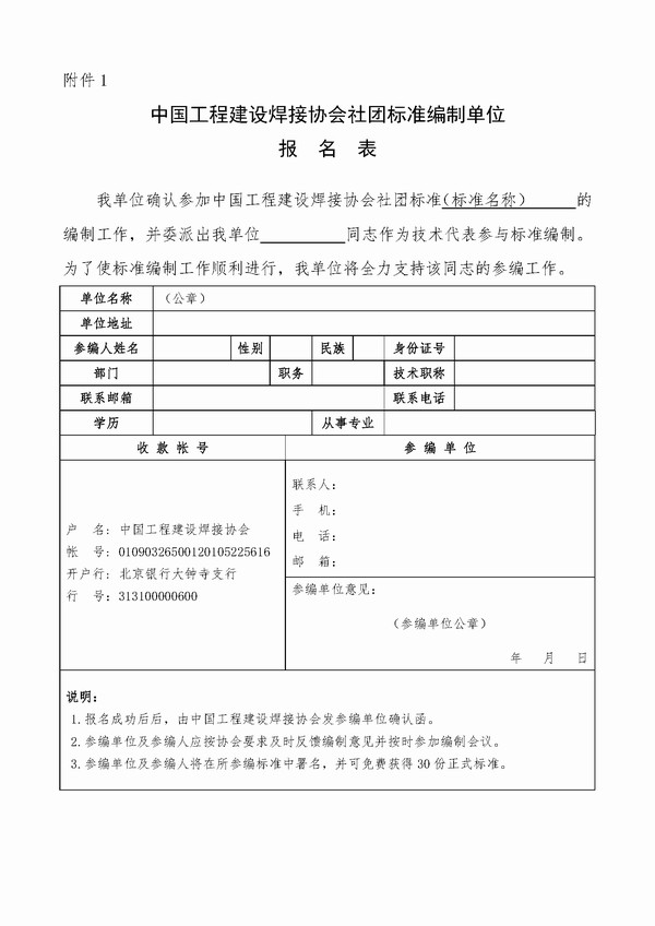 1.填寫“中國工程建設(shè)焊接協(xié)會團(tuán)體標(biāo)準(zhǔn)參編單位報名表”(見附件1),單位負(fù)責(zé)人簽署意見并加蓋公章;