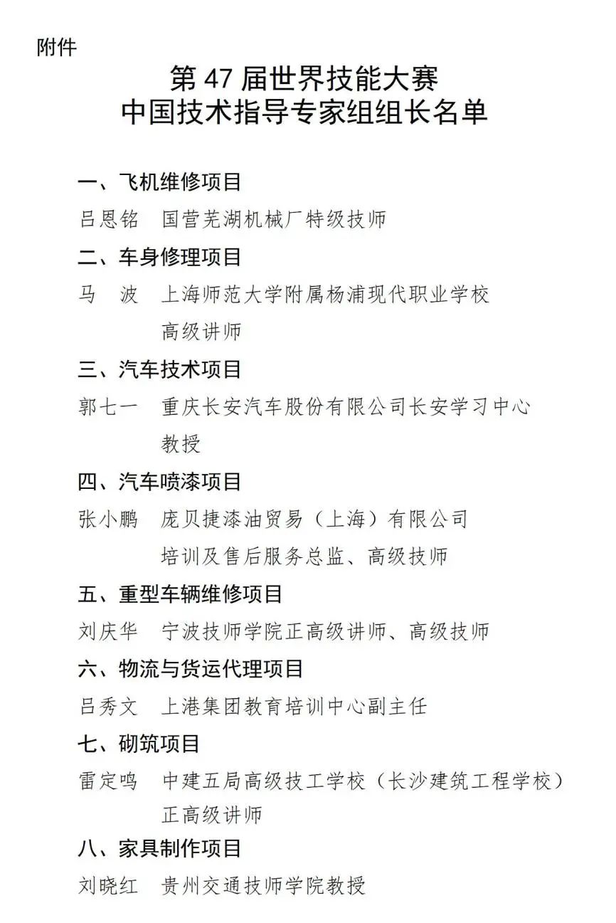 為積極備戰(zhàn)第47屆世界技能大賽,根據(jù)《世界技能大賽參賽管理暫行辦法》,經(jīng)第47屆世界技能大賽中國組委會研究,確定呂恩銘等59名同志為第47屆世界技能大賽中國技術(shù)指導(dǎo)專家組組長。