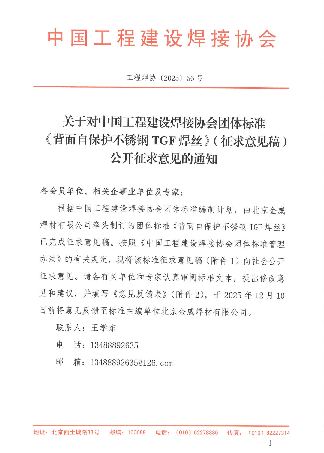 《背面自保護不銹鋼TGF焊絲》(征求意見稿)公開征求意見的通知