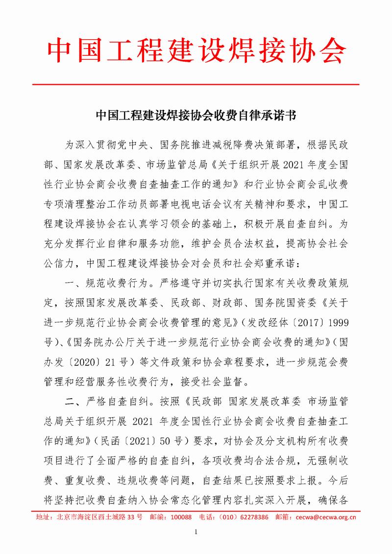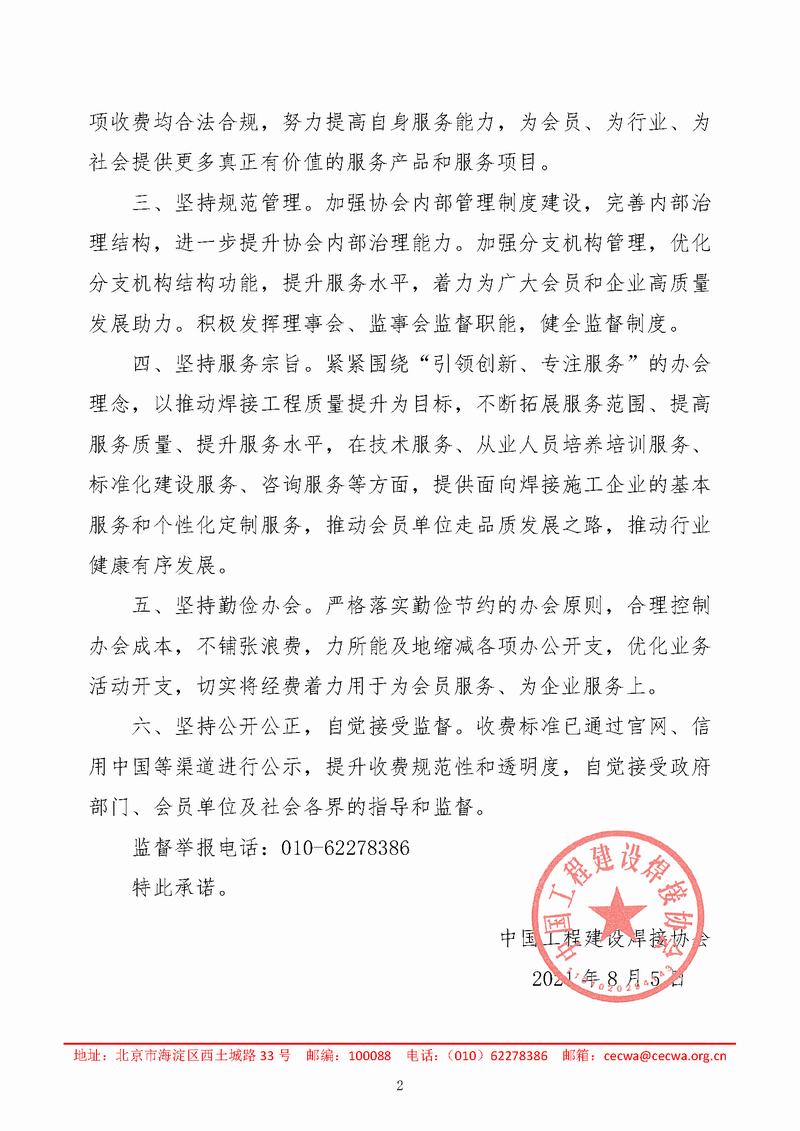 為深入貫徹黨中央、國務院推進減稅降費決策部署,根據民政部、國家發展改革委、市場監管總局《關于組織開展2021年度全國性行業協會商會收費自查抽查工作的通知》和行業協會商會亂收費專項清理整治工作動員部署電視電話會議有關精神和要求,中國工程建設焊接協會在認真學習領會的基礎上,積極開展自查自糾。為充分發揮行業自律和服務功能,維護會員合法權益,提高協會社會公信力,中國工程建設焊接協會對會員和社會鄭重承諾: